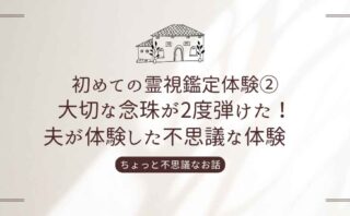 占い体験・自己成長の記録【初めての霊視鑑定体験②】大切な念珠が2度弾けた!夫が体験した不思議な体験 ラピスラズリの念珠が、多忙な転勤族の夫を守る存在になった不思議な体験を紹介します。占いやお守り、パワーストーンに興味がある方にもおすすめの50代の占い体験談です。 2025.08.28占い体験・自己成長の記録