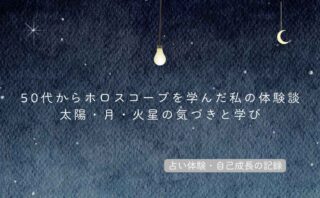 占い体験・自己成長の記録50代からホロスコープを学んだ私の体験談|太陽・月・火星の気づきと学び 50代から学んだホロスコープ体験談。太陽星座・月星座・火星の意味を初心者向けに解説し、鑑定や講座で得た自己理解のヒントをまとめました。 2025.05.26占い体験・自己成長の記録